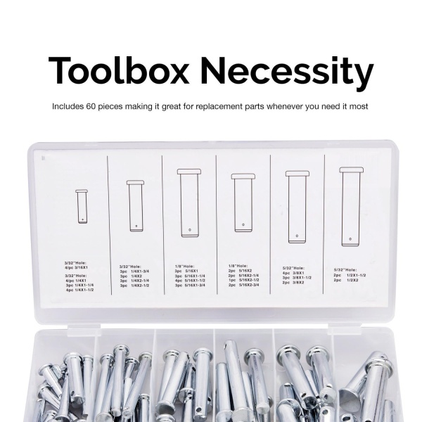 - INCLUDED: Our steel pin clevis zinc set comes neatly organized in a divided transparent case for easy storage and high visibility. The assorted set includes three-hole sizes: 3/32″ x 26 Pieces, 1/8″ x 20 Pieces, and 5/32″ x 14 Pieces.