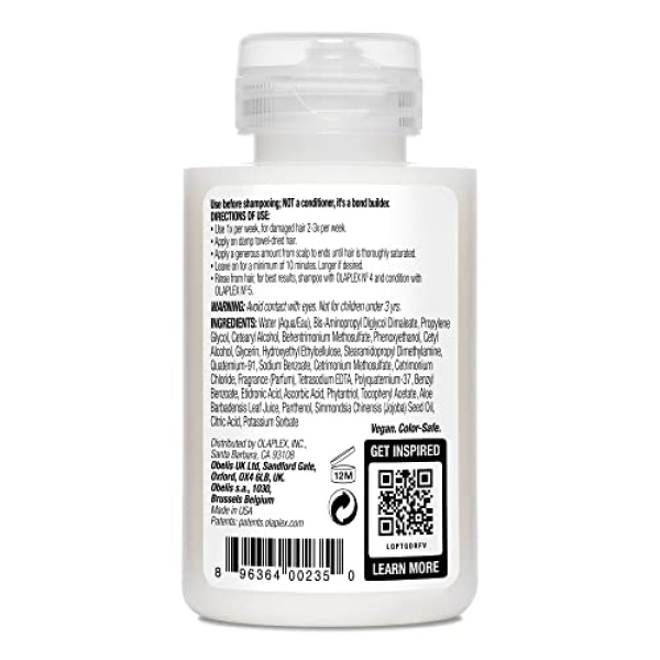 OLAPLEX No.3 at home hair repairing treatment. No.3 Hair Perfector is not a conditioner. No.3 is our at home bond builder that contains the same active ingredient found in all professional Lapel products. Our patented technology relinks the broken bonds in every type of hair providing real, structural repair that works from within. Leaves hair stronger than ever. Paraben-free, vegan, sulfate-free and phthalate-free. Ingredients: Water, Bis-Aminopropyl Diglycol Dimaleate, Propylene Glycol, Cetearyl Alcohol, Ascorbic Acid (Vitamin C), Tocopheryl Acetate (Vitamin E), Prunus Amygdalus Dulcis (Sweet Almond) Oil, Aloe Barbadensis Leaf Juice, Phytantriol, Panthenol, Simmondsia Chinensis (Jojoba) Seed Oil, Behentrimonium Methosulfate, Cetyl Alcohol, Glycerin, Stearamidopropyl Dimethylamine, Hydroxyethyl Ethylcellulose, Quaternium-91, Cetrimonium Methosulfate,?Cetrimonium Chloride, Fragrance, Polyquaternium-37, Tetrasodium EDTA, Magnesium Nitrate, Butylphenyl Methylpropional, Magnesium Chloride, Etidronic Acid, Potassium Sorbate, Phenoxyethanol, Citric Acid, Disodium EDTA, Sodium Benzoate. Cruelty-free and nut free.