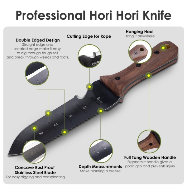 - Wonderfully Versatile: Hori Hori garden knife for every job in the garden, use it for digging, transplanting, sawing, cutting, removing, dividing, and even measuring soil depth for planting.